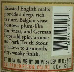 Brewer Description: (from bottle) Roasted English malts provide a deep, rich texture, Belgian yeast bestows plum-like fruitiness, and German hops add spicy aromas as Dark Truth Stout mellows to a smooth, dry, smoky finish.