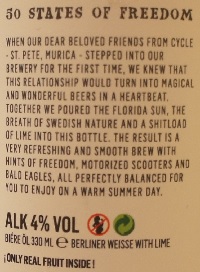 Brewer Description: (from bottle) When our dear beloved friends from Cycle – St. Pete, Murcia – stepped into our brewery for the first time, we knew that this relationship would turn into magical and wonderful beers in a heartbeat. Together we poured the Florida sun, the breath of Swedish nature and a shitload of lime into this bottle. The result is a very refreshing and smooth brew with hints of freedom, motorized scooters and bald eagles, all perfectly balanced for you to enjoy on a warm summer day.
