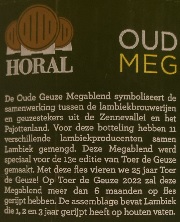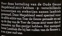(translated to English) For this bottling of the Oude Geuze Megablend, 9 different breweries and blenders mixed lambic together. This Megablend was specially made for the tenth edition of ‘Toer de Geuze’ and will have matured in the bottle for more than 6 months on the day of the Toer de Geuze 2015. The mixture contains Lambic that was 1, 2 and 3 years old when the bottles were filled.