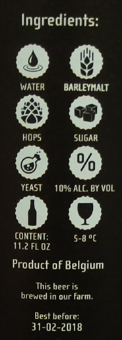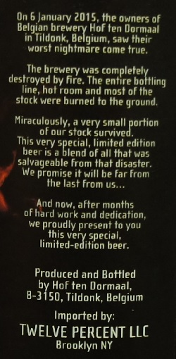 Brewer Description: (from bottle) Our Barbera is a special, annual release. We age this beer for 8 months on barbera grape must, giving it a distinct and complex tannic quality. The end product is an original, hand-crafted product from our family to yours without compromise. Fam. Janssens.