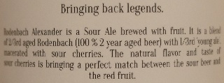 Brewer Description: (from bottle) Rodenbach Alexander is a Sour Ale brewed with fruit. It is a blend of 2/3rd aged Rodenbach (100% 2 year aged beer) with 1/3rd ‘young ale’, macerated with sour cherries. The natural flavor and taste of sour cherries is bringing a perfect match between the sour beer and the red fruit.