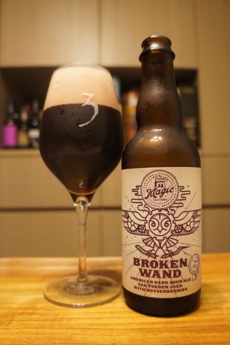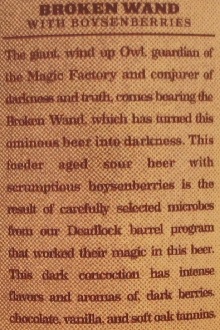Brewer Description: (from bottle) The giant, wind up Owl, guardian of the Magic Factory and conjurer of darkness and truth, comes bearing the Broken Wand, which has turned this ominous beer into darkness. This foeder aged sour beer with scrumptious boysenberries is the result of carefully selected microbes from our Deadlock barrel program that worked their magic in this beer. This dark concoction has intense flavors and aromas of, dark berries, chocolate, vanilla, and soft oak tannins.