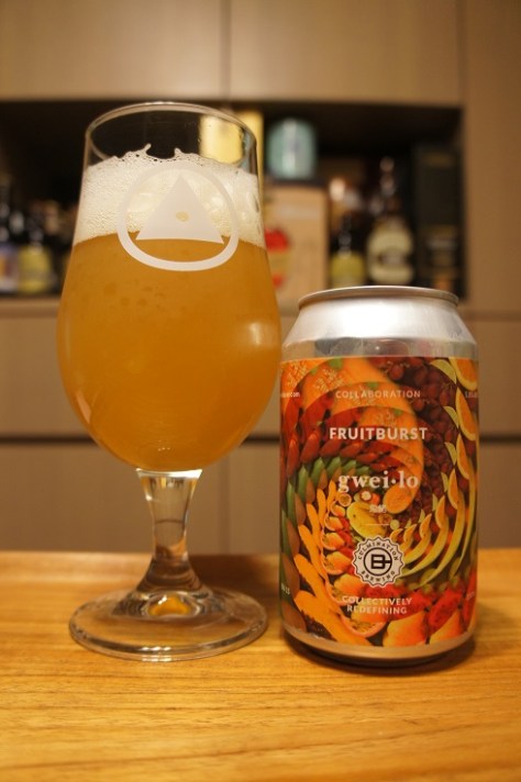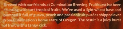 Brewer Description: (from can) Brewed with our friends at Culmination Brewing, Fruitburst is a beer erupting with tart tropical fruits. We’ve used a light wheat base and pumped it full of guava, peach and passionfruit purees shipped over from Culmination’s home state of Oregon. The result is a juicy burst of fruit with a tangy kick.