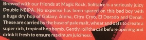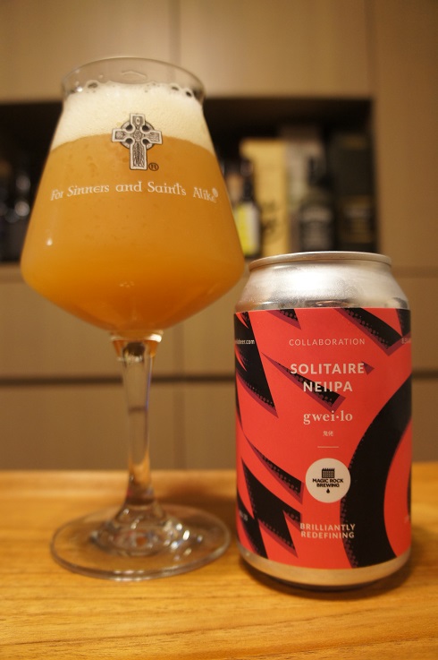 Brewer Description: (from can) Brewed with our friends at Magic Rock, Solitaire is a seriously juicy Double NEIPA. No expense has been spared on this bad boy with a huge dry hop of Galaxy, Aloha, Citra Cryo, El Dorado and Denali. These are carried by the base of pale malt, wheat and oats to create a super rich, tropical hop bomb. Gently roll the can before opening and drink it fresh to ensure maximum juiciness.