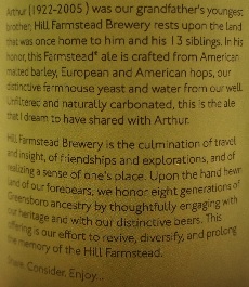 Brewer Description: (from bottle) Arthur (1922-2005) was our grandfather’s youngest brother; Hill Farmstead Brewery rests upon the land that was once home to him and his 13 siblings. In his honor, this Farmstead ale is crafted from American malted barley, European and American hops, our distinctive farmhouse yeast and water from our well. Unfiltered and naturally carbonated, this is the ale that I dream to have shared with Arthur.