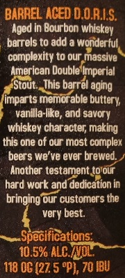 Brewer Description: (from bottle) This extreme Double Oatmeal Russian Imperial Stout will overwhelm, satisfy, and destroy your taste buds like no other!! D.O.R.I.S. is even darker, hoppier, and stronger than our gold medal winning B.O.R.I.S. The Crusher Stout. Dry-hopped and first wort hopped with the finest American hops for a great Imperial Stout experience! Enjoy the darkness!!