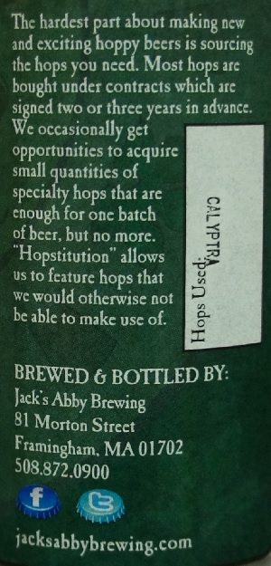 Brewer Description: (from bottle) The hardest part about making new and exciting hoppy beers is sourcing the hops you need. Most hops are bought under contracts which are signed two or three years in advance. We occasionally get opportunities to acquire small quantities of specialty hops that are enough for one batch of beer, but no more. “Hopstitution” allows us to feature hops that we would otherwise not be able to make use of.
