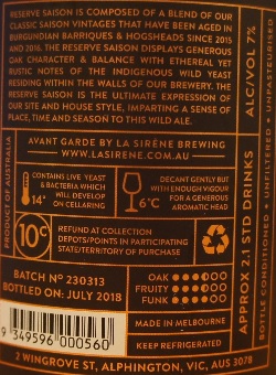 Brewer Description: (from bottle) Reserve Saison is composed of a blend of our classic Saison vintages that have been aged in Burgundian barriques & hogsheads since 2015 and 2016. The Reserve Saison displays generous oak character & balance with ethereal yet rustic notes of the indigenous wild yeast residing within the walls of our brewery. The Reserve Saison is the ultimate expression of our site and house style, imparting a sense of place, time and season to this wild ale.
