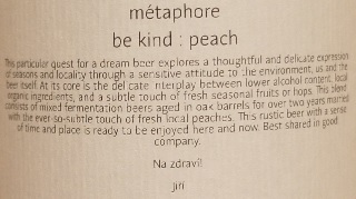 Brewer Description: (from bottle) This particular quest for a dream beer explores a thoughtful and delicate expression of seasons and locality through a sensitive attitude to the environment, us and the beer itself. At its core is the delicate interplay between lower alcohol content, local organic ingredients, and a subtle touch of fresh seasonal fruits or hops. This blend consists of mixed fermentation beers aged in oak barrels for over two years married with a gentle use of fresh local quinces. This rustic beer with a sense of time and place is ready to be enjoyed here and now. Best shared in good company. Na zdravi! Jiří.