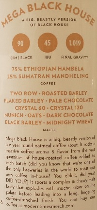 Other Notes: Special Release. 60 IBUs. Imperial Stout with coffee added. Malts – Barley, Oats, Munich, Chocolate, Midnight Wheat, Black Barley, Aromatic Roast Barley, Flaked Barley and Biscuit Malt. Coffee – 75% Ethiopian Hambela and 25% Sumatra Mandheling