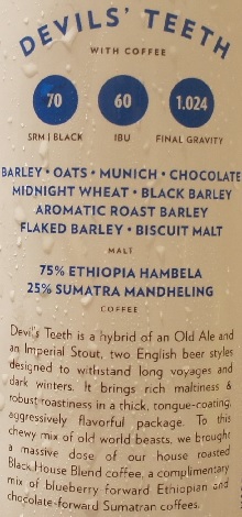 Brewer Description: (from bottle) Devil’s Teeth is a hybrid of an Old Ale and an Imperial Stout, two English beer styles designed to withstand long voyages and dark winters. It brings rich maltiness & robust roastiness in a thick, tongue-coating, aggressively flavorful package. To this chewy mix of old world beasts, we brought a massive dose of our house roasted Black House Blend coffee, a complimentary mix of blueberry-forward Ethiopian and chocolate-forward Sumatran coffee.
