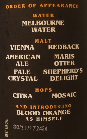 Other Notes: Water – Melbourne water. Malt – Vienna, Redback, American Ale, Maris Otter, Pale Crystal and Shepherd’s Delight. Hops – Citra and Mosaic. Adjunct – Blood Orange.
