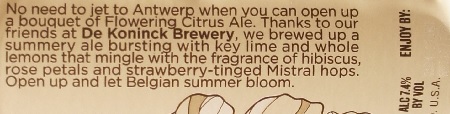 Brewer Description: (from bottle) No need to jet to Antwerp when you can open up a bouquet of Flowering Citrus Ale. Thanks to our friends at De Koninck Brewery, we brewed up a summery ale bursting with key lime and whole lemons that mingle with the fragrance of hibiscus, rose petals and strawberry-tinged Mistral hops. Open up and let Belgian summer bloom.