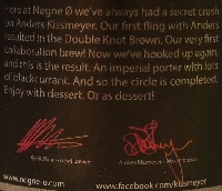 Brewer Description: (from bottle) Here at Nøgne Ø we’ve always had a secret crush on Anders Kissmeyer. Our first fling with Anders resulted in the Double Knot Brown. Our very first collaboration brew! Now we’ve hooked up again, and this is the result. An imperial porter with lots of blackcurrant. And so the circle is completed. Enjoy with dessert. Or as dessert!