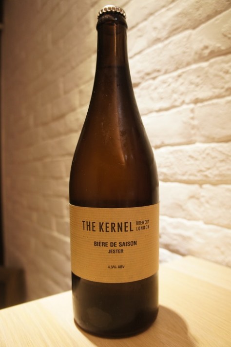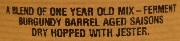Brewer Description: (from bottle) A blend of one year old mix – ferment Burgundy barrel aged Saisons dry hopped with Jester.