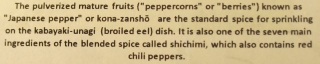 Brewer Description: (from bottle) The pulverized mature fruits (“peppercorns” or “berries”) known as “Japanese pepper” or kona-zanshõ are the standard spice for sprinkling on the kabayaki-unagi (broiled eel) dish. It is also one of the seven main ingredients of the blended spice called shichimi, which also contains red chili peppers.