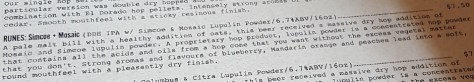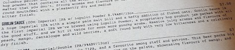 Brewer Description: (from website & menu) A huge Imperial IPA with a simple pale malt bill and a hefty addition of flaked oats. Goblin Sauce is the first Imperial IPA we’ve brewed using Lupulin Powder, a proprietary hop product jam packed with all the good stuff… and we hit it twice for even more punchy aroma. Massive juicy aromas and flavours of peach, mango, cantaloupe and wild berries, a soft round body with very low bitterness and a relatively dry finish.