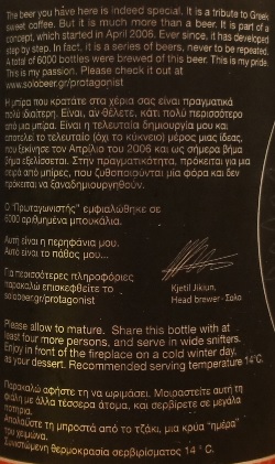 Brewer Description: (from bottle) The beer you have here is indeed special. It is a tribute to Greek sweet coffee. But it is much more than a beer. It is part of a concept, which started in April 2006. Ever since, it has developed step by step. In fact, it is a series of beers, never to be repeated. A total of 6000 bottles were brewed of this beer. This is my pride. This is my passion. Please check it out at http://www.solobeer.gr/protagonist. Please allow to mature. Share this bottle with at least four more persons, and serve in wide snifters. Enjoy in front of the fireplace on a cold winter day, as your dessert. Recommended serving temperature 14°C.