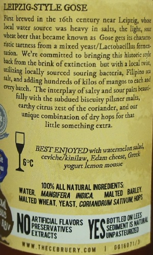 Brewer Description: (from bottle) First brewed in the 16th century near Leipzig, whose local water source was heavy in salts, the light, sour wheat beer that became known as Gose gets its characteristic tartness from a mixed yeast/Lactobacillus fermentation. We’re committed to bringing this historic style back from the brink of extinction but with a local twist, utilizing locally sourced souring bacteria, Filipino sea salt, and adding hundreds of kilos of mangoes to each and every batch. The interplay of salty and sour pairs beautifully with the subdued biscuity pilsner malts, earthy citrus zest of the coriander, and our unique combination of dry hops for that little something extra.