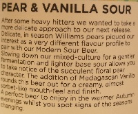 Taste: Sour, tart, sweet, pear, baked/poached pear, with notes of vanilla.