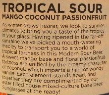 Brewer Description: (from bottle) As winter draws nearer, we look to sunnier climates to bring you a taste of the tropics in your glass. Having ripened in the far-off sunshine we’ve picked a mouth-watering medley to transport you to a world of tropical tartness in this Modern Sour Beer. A sweet mango base and floral passionfruit tartness are unified by the creamy character of coconut, which imparts a hint of woody vanilla. Each element stands apart and together they are complimented by our ester filled house mixed-culture base beer. Sunglasses at the ready!