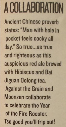 Brewer Description: (from bottle) A collaboration. Ancient Chinese proverb states: “Man with hole in pocket feels cocky all day.” So true… as true and righteous as this auspicious red ale brewed with Hibiscus and Bai Jiguan Oolong tea. Against the Grain and Moonzen collaborate to celebrate the Year of the Fire Rooster. Tso good you’ll frip out!