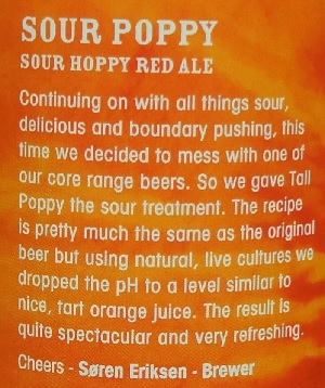 Brewer Description: (from bottle) Continuing on with all things sour, delicious and boundary pushing, this time we decided to mess with one of our core range beers. So we gave Tall Poppy the sour treatment. The recipe is pretty much the same as the original beer but using natural, live cultures we dropped the pH to a level similar to nice, tart orange juice. The result is quite spectacular and very refreshing. Cheers.