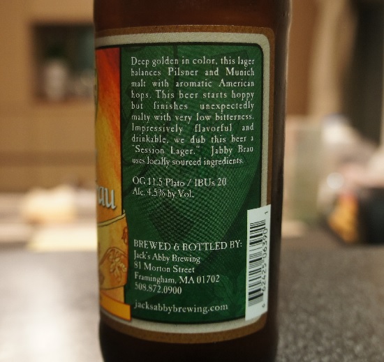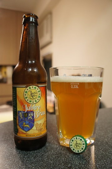 Brewer Description: (from bottle) Deep golden in color, this lager balances Pilsner and Munich malt with aromatic American hops. This beer starts hoppy but finishes unexpectedly malty with very low bitterness. Impressively flavourful and drinkable, we dub this beer a “Session Lager.” Jabby Brau uses locally sourced ingredients.