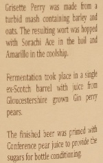 Brewer Description: (from bottle) This little mixed fermentation beer is a part of my continuous search of the sense of place and finding new avenues for expressing seasonal and local flavours in beer. A crispy little reminder of seizing opportunity every day to experience simple, perhaps even whimsical and too often unexpected joys around us. This grisette is built completely from local organic ingredients. It was hopped very generously with Saaz and Mandarina and complemented with just a dash of Riesling grapes. After long conditioning it was then bottled with local honey for that lively effervescence. Enjoy it preferably fresh but it will continue to evolve in the bottle for many moons on. Na zdraví!