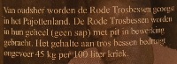 (translated into English) Traditionally, the red currants are harvested in the Pajottenland. The red currants are processed whole (no juice) with stone. The red currant content is approximately 45 kg per 100 liters of cherry lambic.