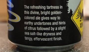 Brewer Description: (from can) The refreshing tartness in this devine, bright golden-colored ale gives way to earthy undertones and hints of citrus followed by a slight sea salt-like dryness and tangy, effervescent finish.