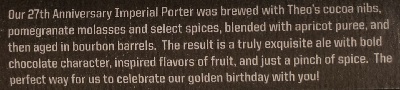 Brewer Description: (from bottle) In celebration of our 29th anniversary this year’s Imperial Porter delivers notes of dark chocolate and cinnamon spice with hints of coconut, vanilla, and dried fruit finished by a warm dash of cayenne.