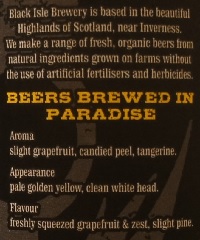 Brewer Description: (from bottle) Aroma – slight grapefruit, candied peel, tangerine. Appearance – pale golden yellow, clean white head. Flavour – freshly squeezed grapefruit & zest, slight pine.