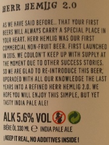 Brewer Description: (from bottle) As we have said before.. That your first beers will always carry a special place in your heart. Herr Hemlig was our first commercial non-fruit beer. First launched in 2015. We couldn’t keep up with supply at the moment due to other success stories. So we are glad to re-introduce this beer, upgraded with all our knowledge the last years into a refined Herr Hemlig 2.0. We hope you will enjoy this simple, but yet tasty India Pale Ale!