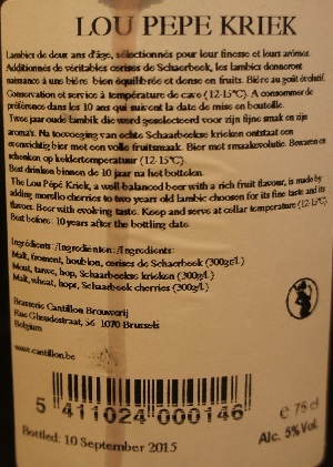Brewer Description: (from bottle) The Lou Pepe Kriek, a well-balanced beer with a rich fruit flavour, is made by adding Morello cherries to two years old lambic choosen for its fine taste and its flavours.