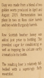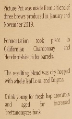 Brewer Description: (from bottle) Picture Pot was made from a blend of three brews produced in January and November 2019. Fermentation took place in Californian Chardonnay and Herefordshire cider barrels. The resulting blend was dry hopped with whole leaf Loral and Enigma. Drink young for fresh hop aromatics and aged for increased brettanomyces funk.