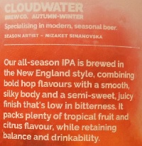 Other Notes: Autumn-Winter 18. Aroma & Flavour – Zesty citrus fruit in both flavour and aroma, backed up by resinous hop notes. Body – Medium bodied and velvety with soft carbonation. Aftertaste – Lingering juicy fruit flavours. Dry hop intensity – 16 g/L