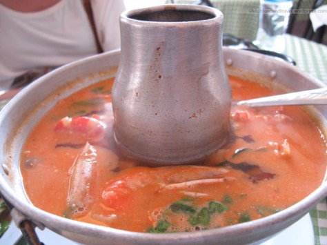 Tom Yum Goong – In many places in Thailand, I have found the level of spicyness for Tom Yum to be insufficient. I suspect that the chef is trying accomodate for the tourists who aren’t necessarily accustomed to spicy food. Me who loves spicy food however, has been disappointed with those places as Tom Yum is supposed to be spicy! Luckily, at Dee’s, the soup was made spicy and quite tasty. The shrimp however was overcooked probably due to the soup continually being heated at the table.