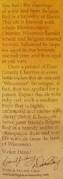 Brewer Description: (from bottle) You hold the marriage of wine and beer. Belgian Red is a tapestry of flavor. This ale is brewed with whole Montmorency Cherries, Wisconsin farmed wheat and Belgian roasted barleys, balanced by hops we aged in our brewery one full year, and then aged in oak vats. Over a pound of Door County Cherries in every bottle makes this ale uniquely “Wisconsin”. So unique, in fact, that we applied for a patent. Expect this ale to be ruby red, with a medium body that is highly carbonated and intense with cherry flavor & bouquet. Serve your friends Belgian Red in a brandy sniffer or champagne flute and toast life with ale from the land of Wisconsin.