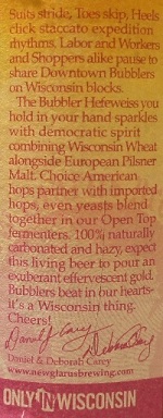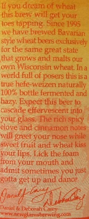 Brewer Description: (from bottle) If you dream of wheat this brew will get your toes tapping. Since 1995 we have brewed Bavarian style wheat beers exclusively for the same great state that grows and malts our own Wisconsin wheat. In a world full of posers this is a true hefe-weizen naturally 100% bottle fermented and hazy. Expect this beer to cascade effervescent into your glass. The rich spicy clove and cinnamon notes will greet your nose while sweet fruit and wheat kisses your lips. Lick the foam from your mouth and admit sometimes you just gotta get up and dance.