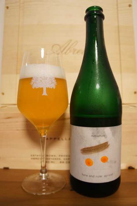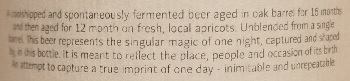 Brewer Description: (from bottle) A coolshipped and spontaneously fermented beer aged in oak barrel for 16 months and then aged for 12 months on fresh, local apricots. Unblended from a single barrel. This beer represents the singular magic of one night, captured and shaped by, in this bottle. It is meant to reflect the place, people and occasion of its birth. An attempt to capture a true imprint of one day – inimitable and unrepeatable.