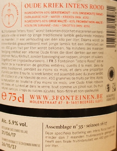 This is the first of such blends to be released. Sour cherries were macerated partly on young peated lambik and partly on two-year old straight lambik in a stainless steel tank. We blended with young and three-year old (!) lambik. 55% of the blend is old lambik and the final fruit intensity is 567 grams of sour cherries per litre.