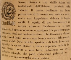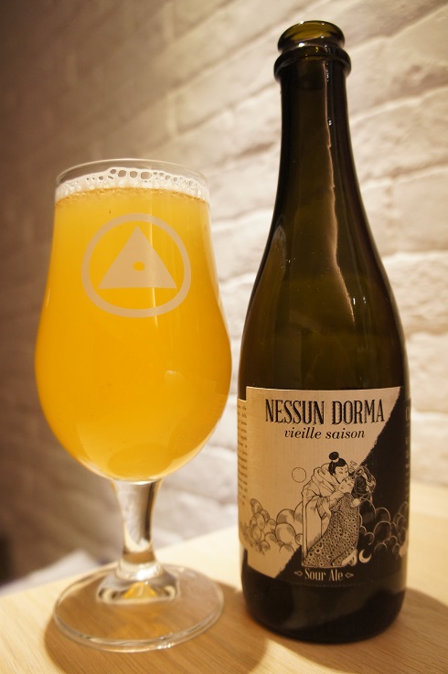 Brewer Description: (from bottle in Italian) Nessun Dorma è una Vieille Saison, stile tradizionale dell’Hainaut, provincia della Vallonia. Il mosto, realizzato con buona percentuale di frumento non maltato e avena, riceve una luppolatura delicata di luppoli nobili. A seguito di una fermentazione in acciaio attraverso Saccharomyces, la birra affina da 6 a 8 mesi in tonneaux e barriques (che precedentemente contenevano vino), con contaminazione di brettanomiceti e batteri lattici. Il blend finale produce una bevuta rustica e dalla marcata presenza acidula. Note citriche, speziate e di frutta bianca sono ingentilite da sentori floreali e dalla complessità conferita dal legno. Nessun Dorma è una birra rinfrescante con una profondità selvaggia, che potrà certamente godere di un ulteriore invecchiamento nella vostra cantina.