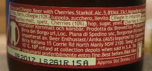 Brewer Description: (from website) Prunus (from the cherry’s bothanical name, Prunus Avium or Cerasus according to variety) is made adding to our spelt beer Duchessa about 20% of fresh cherries with their stones. Differently from the typical Belgian kriek, it is not too sour as it keeps some of the Duchessa’s smoothness. Yet it’s not sugary indeed, thanks to the well balanced bitter aftertaste.