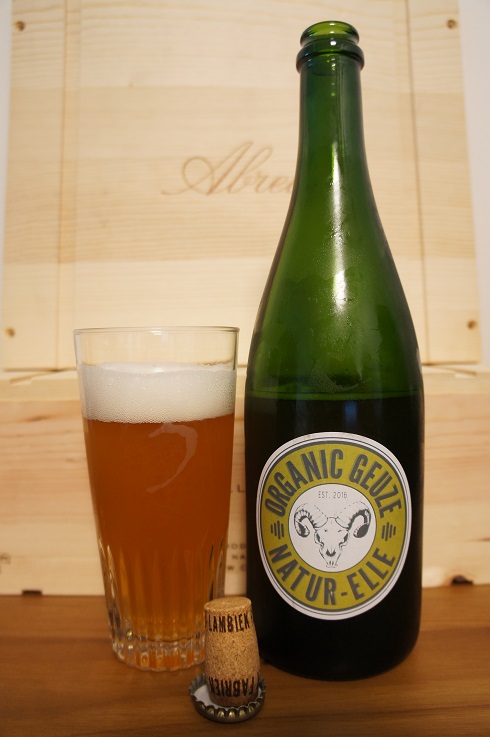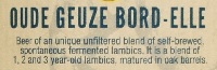 (translated to English) Bio gueuze from self-brewed organic lambics with refermentation in the bottle. This unique blend of different vintages is completely organic, pure, unfiltered and unpasteurized.
