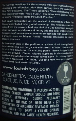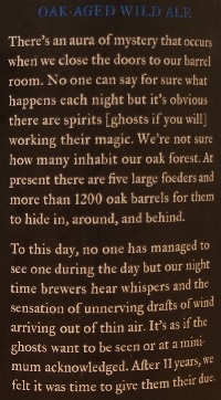 Brewer Description: (from bottle) There’s an aura of mystery that occurs when we close the doors to our barrel room. No one can say for sure what happens each night but it’s obvious there are spirits [ghosts if you will] working their magic. We’re not sure how many inhabit our oak forest. At present there are five large foeders and more than 1200 oak barrels for them to hide in, around, and behind. To this day, no one has managed to see one during the day but our night time brewers hear whispers and the sensation of unnerving drafts of wind arriving out of thin air. It’s as if the ghosts want to be seen or at a minimum acknowledged. After 11 years, we felt it was time to give them their due.