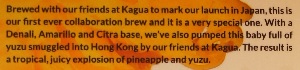 Brewer Description: (from can) Brewed with our friends at Kagua to mark our launch in Japan, this is our first ever collaboration brew and it is a very special one. With a Denali, Amarillo and Citra base, we’ve also pumped this baby full of yuzu smuggled into Hong Kong by our friends at Kagua. The result is a tropical, juicy explosion of pineapple and yuzu.