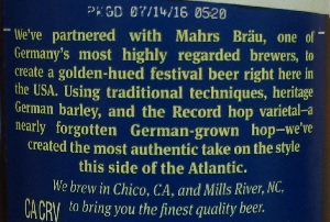 Other Notes: 20 IBUs. Fall seasonal. Malts – Two-row Pale, Steffi, Pilsner and Munich. Hops – Sterling, Spalter and Record