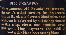 Brewer Description: (from bottle) We’ve partnered with Bavaria’s Weihenstephan, the world’s oldest brewery, for this American take on the classic German Oktoberfest. A malt backbone is balanced by subtle hop character in this crisp, clean, and drinkable crowd-pleaser – nothing captures the spirit of celebration like a beer among friends.