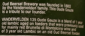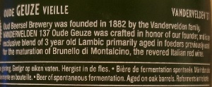 Brewer Description: (from bottle) Vandervelden 135 Oude Geuze is a blend of 1 year old lambic aged on foeders that were previously used for mainly red Brunello di Montalcino wine and of 3 year old Lambic aged on an old Oud Beersel foeder.